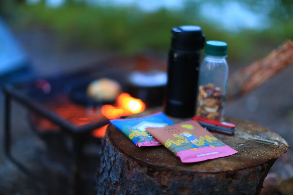 焚き火で沸いた湯をやや冷まし、珈琲の粉に落とす。再び良い香り。蒸らして湯を注ぎ湯を注ぎ、抽出を待つ良い時間。湯を入れ終えたらフライパンのレーズンスコーンを、組んだ焚き火の薪に載せ遠火で温め。湯の切れたドリップバッグは火にくべる。カヌーが1艘、一人を乗せて過ぎていく。